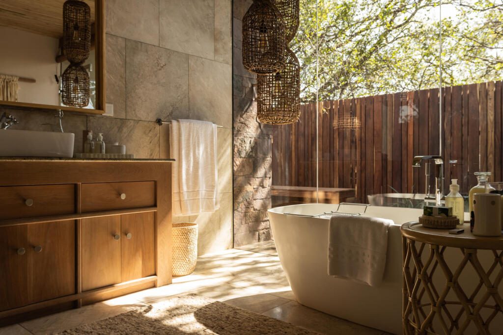 Serengeti House centers on four suites with generous bathrooms, outdoor showers and private terraces around a central shared living space.