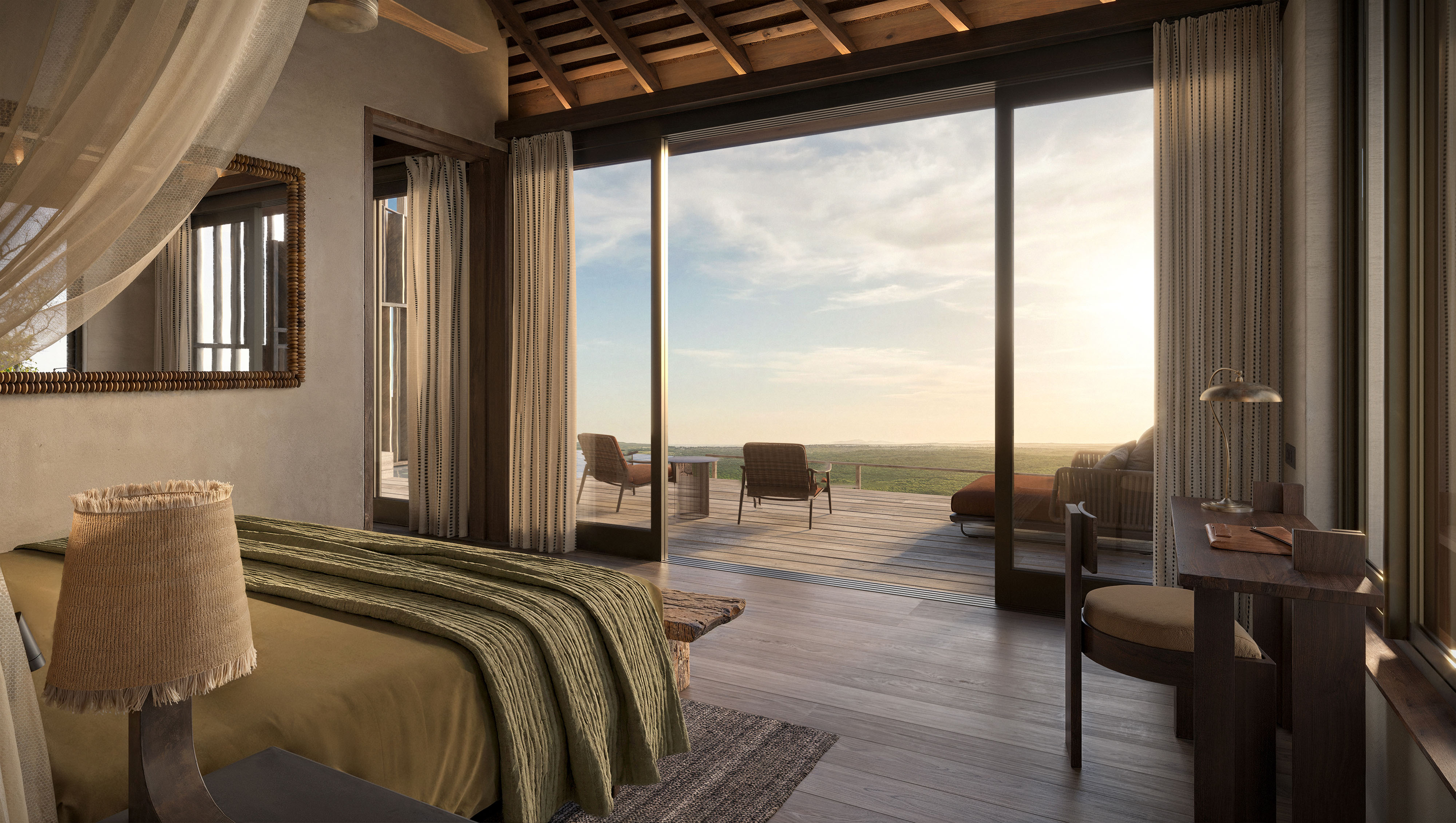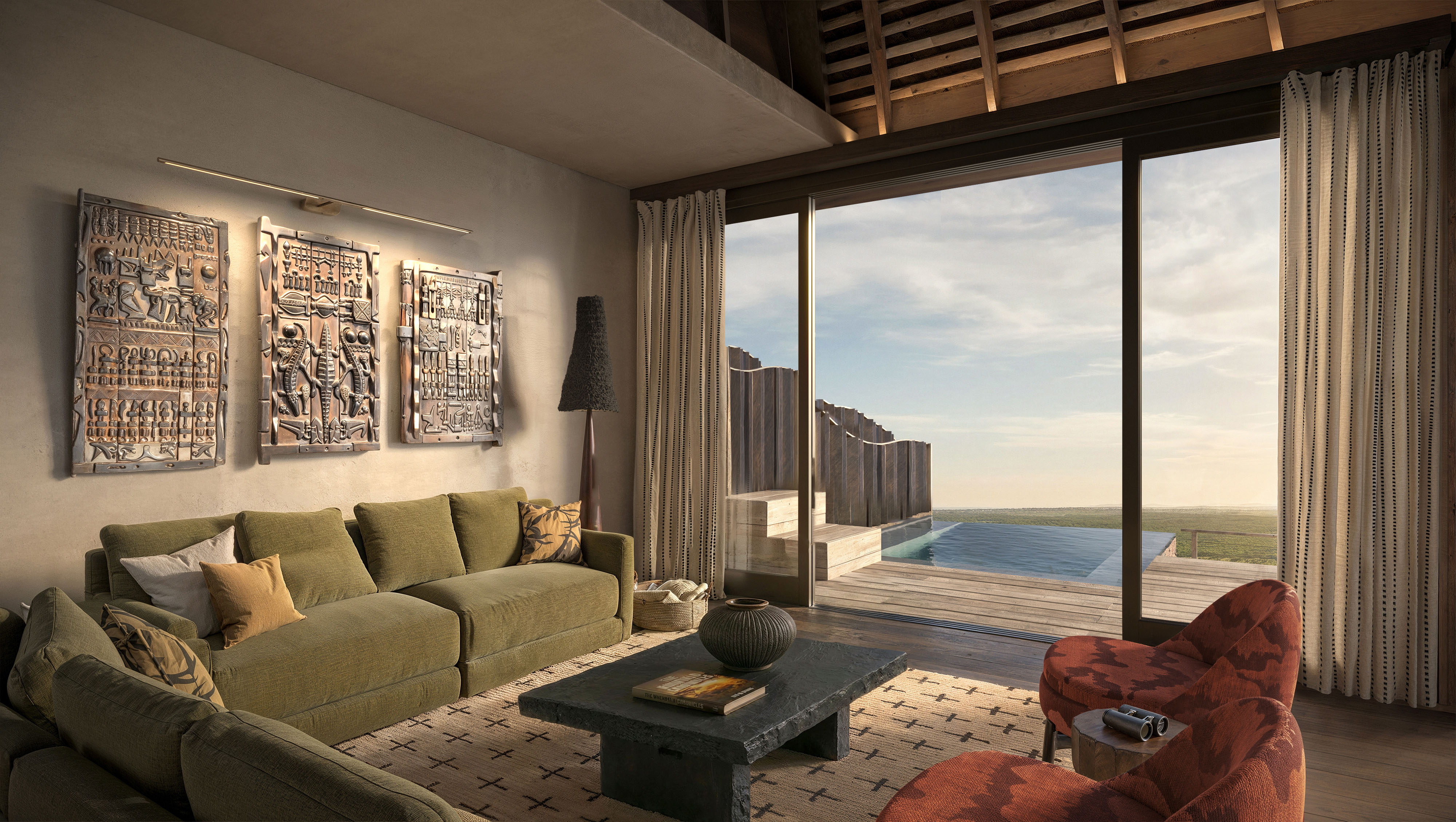 Hilltop safari lodge with vaulted interiors, artisanal details, and expansive bush views.